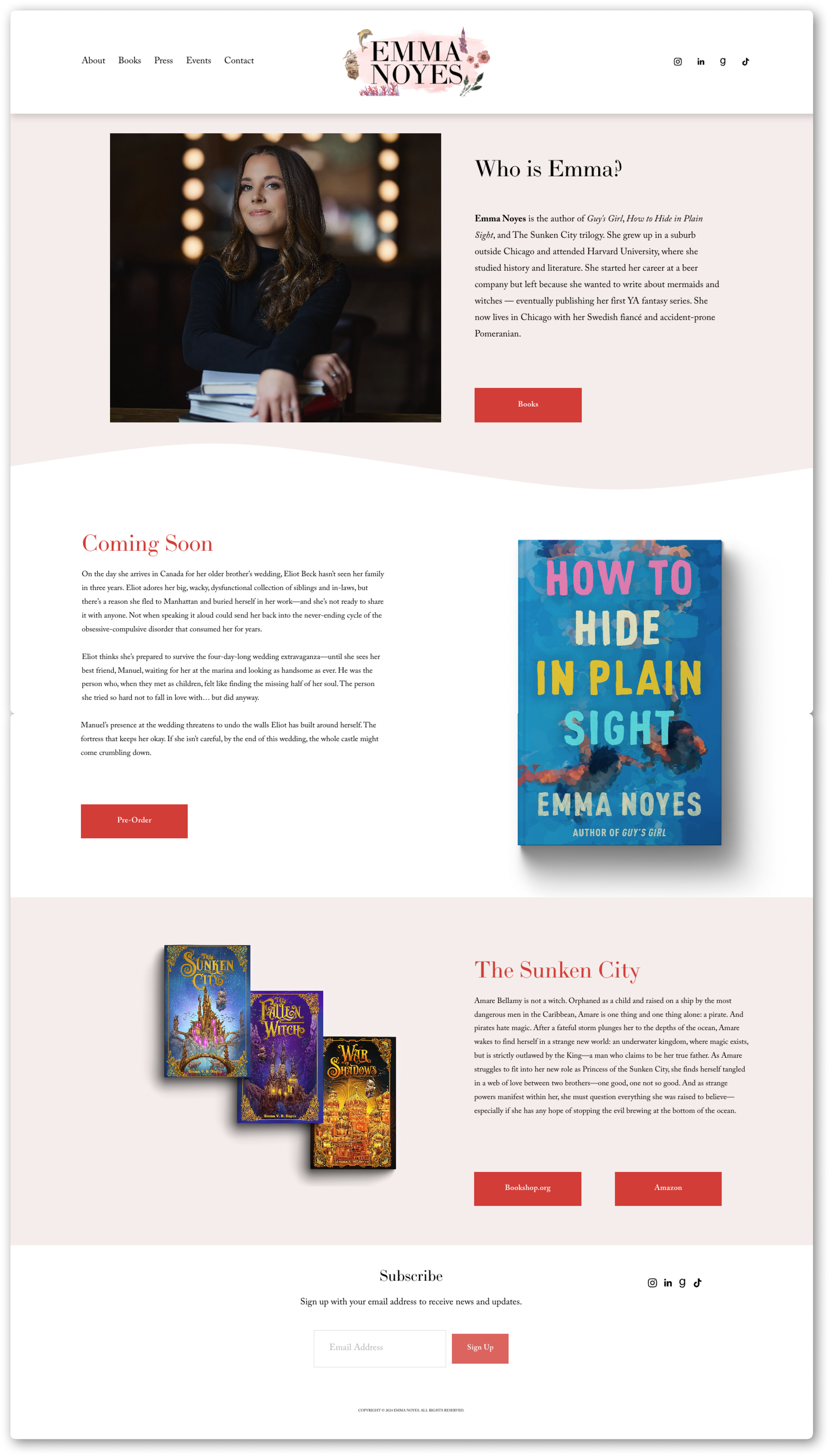Emma Noyes is the author of Guy's Girl, How to Hide in Plain Sight, and The Sunken City trilogy. She grew up in a suburb outside Chicago and attended Harvard University, where she studied history and literature. She started her career at a beer company but left because she wanted to write about mermaids and witches — eventually publishing her first YA fantasy series.